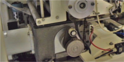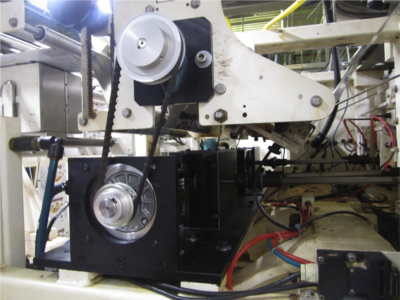 After – The FFI Upgraded Hayssen (2) Servo Motor replacement. One Servo drives a spur gear to drive both belt shafts. Includes torque increasing reduction ratio and easily serviceable timing drive belt. Second Servo drives film registration roller. (Clutch break removed)